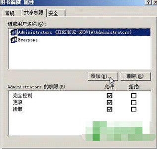 第2步,打開“圖書編撰 屬性”對話框,切換到“共享權(quán)限”選項卡,并單擊“添加”按鈕,如圖所示。