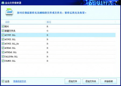 如果你的隱私文件還沒有刪除,并且數量也不是很多,那么完全可以通過文件粉碎工具來徹底刪除它,以金山毒霸為例,在其主界面點擊“百寶箱”按鈕,點擊“文件粉碎”按鈕,打開“金山文件粉碎器”后,點擊“添加文件”或“添加文件夾”按鈕,選擇需要清除的隱私文件,點擊“開始粉碎”即可。由于文件粉碎工具通常會采用多次擦寫覆蓋的辦法 ,因此清除效果甚至好過“完全格式化”。