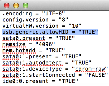 5、選擇用“文本編輯”打開,在文件內(nèi)增加一行,usb.generic.allowHID = "TRUE",這個(gè)就是編輯過程,注意英文引號(hào),可以直接拷貝我這里寫的這行: