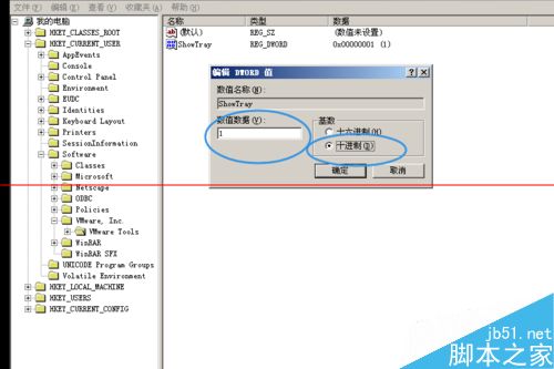 4、點開 showTray 項,選擇 十進制 ,然后把數據修改為 1, 1 =顯示,0=隱藏 ,然后確定,就可以關閉編輯器了