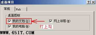 鼠標右鍵點擊桌面空白的地方——>選擇“屬性”——>在彈出的“顯示屬性”對話框中選擇“桌面”選項卡——>點擊最下面的“自定義桌面”——>在彈出的“顯示屬性”對話框中將“我的文檔”前面打上勾——>點擊“確定”退出;