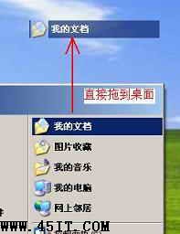 還是在“開始”菜單的右邊找到“我的文檔”圖標——>用鼠標左鍵點住“我的文檔”,將“我的文檔”圖標直接拖動到桌面就可以了;