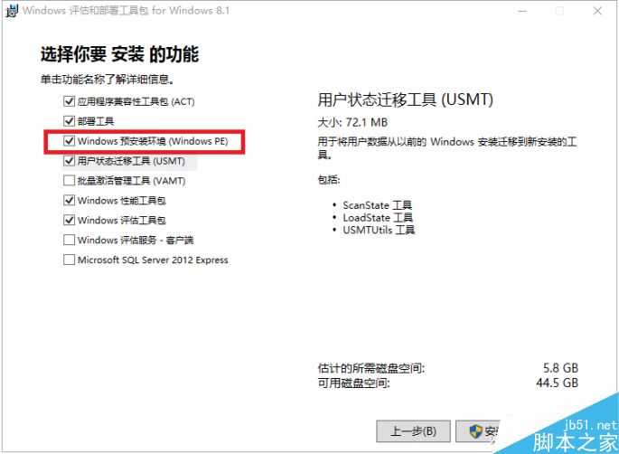 隨后的選項“Windows預安裝環境(Windows PE)”是一定要勾選的,至于其他的工具看個人喜好了。