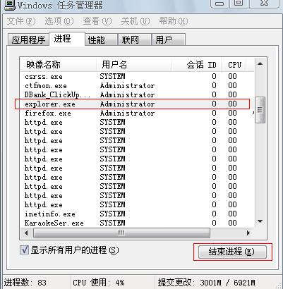 3、刪除完其他軟件的節點后,可以重啟電腦或者在任務管理器中結束explorer.exe進程(如下圖),