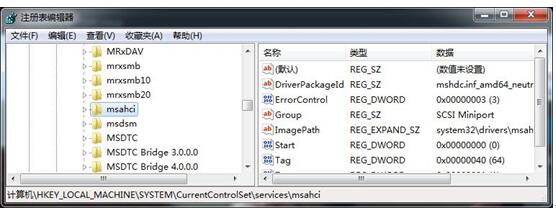 2、在打開的注冊表編輯器左側窗口中,依次定位到以下注冊項HKEY_LOCAL_MACHINE/SYSTEM/ CurrentControlSet/services/msahci。