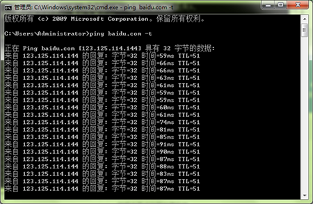 4、再來檢測一下外網的情況。我們可以輸入ping baidu.com -t,為什么要ping 百度呢?因為百度是外部網絡地址,通過觀察電腦與之相連的狀況就可以判斷外網是否正常。像下面這樣的情況就是正常的。