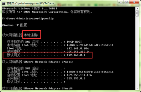 2、出現下面這個DOS窗口,輸入ipconfig,然后回車,看下你的路由網關是多少,我這邊的路由網關是192.168.0.1,不同網絡網關可能不同。