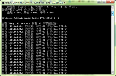 3、然后輸入ping 192.168.0.1 -t,如果你的網關跟我的不一樣,這里就要換成你那邊的網關了,注意這點就行。然后就像下面這樣開始發送和接收數據包,正常情況下都是時間<1ms,而且中間不會出現斷層。如果像下面這樣就說明內網是正常的。