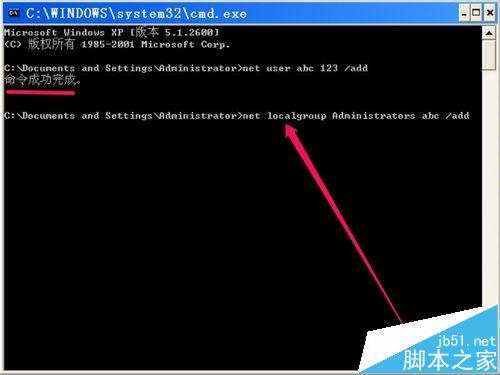 用戶創(chuàng)建完成后,還需要提升為管理員權(quán)限,其命令為net localgroup Administrator abc /add格式,回車。