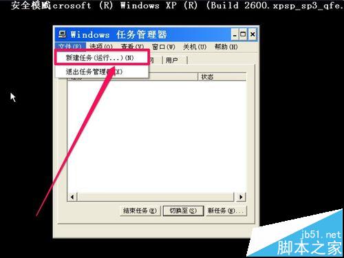 在進(jìn)入帶命公提示的安全模式后,發(fā)現(xiàn)沒(méi)有正常的退出方式,直接硬關(guān)機(jī),又怕?lián)p壞電腦,要怎么退出呢?后來(lái)才發(fā)現(xiàn)一個(gè)方法,先按Ctrl+Alt+Del鍵,調(diào)出任務(wù)管理器,在“文件”菜單下,選擇“新建任務(wù)”這一項(xiàng)。