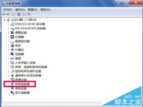 4、進入設備管理器窗口,在設備列表中,找到“網絡適配器”這一項,然后打開它所包含的設備。
