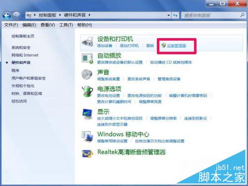 3、在下一個窗口,選擇“設備和打印機”下的“設備管理器”這一項。