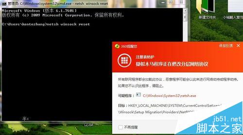 3、出現的命令提示框內輸入“netsh winsock reset",按”Enter“鍵