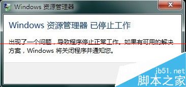 2、同樣是出錯(cuò)提示:Windows 資源管理器已停止工作。可能會(huì)給出不同的詳細(xì)訊息,針對(duì)提示分而治之:出現(xiàn)了一個(gè)問(wèn)題,導(dǎo)致程序停止正常工作。如果有可用的解決方案,Windows將關(guān)閉程序并通知您。
