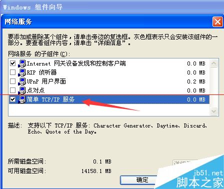 4、驗(yàn)證網(wǎng)絡(luò)服務(wù)設(shè)置,通過(guò)“控制面板->添加或刪除程序->添加/刪除windows組件”,選擇“網(wǎng)絡(luò)服務(wù)->詳細(xì)信息”,驗(yàn)證“簡(jiǎn)單TCP/IP服務(wù)”是否已經(jīng)打開(kāi)。