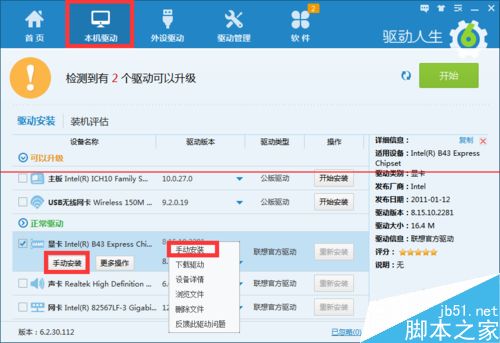 1、首先,我們利用“驅動人生”程序來下載對應的驅動程序,在“本機驅動”選項卡,右擊要“手動”安裝驅動的項,從彈出的右鍵菜單中選擇“手動安裝”項。