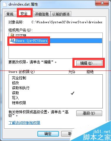 13、從打開的“屬性”窗口中,切換到“安全”選項卡,選中當前用戶名,點擊“編輯”按鈕。
