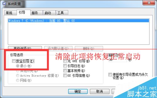 4、待完成有關“安全模式”下的相關操作之后,我們還需要在“安全模式”界面中清除“安全引導”選項,以實現正常啟動Windows操作系統功能。