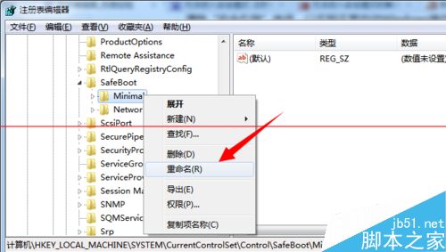 6、從打開的“注冊表編輯器”界面中,依次進入“HKEY_LOCAL_MACHINE/SYSTEM/CurrentControlSet/Control/SafeBoot”,在此可以看到“Minimal”及 “Network”項。