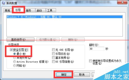 3、從打開的“系統配置”界面中,切換到“引導”選項卡,勾選“安全引導”和“最小化”兩個項目,點擊“確定”按鈕。
