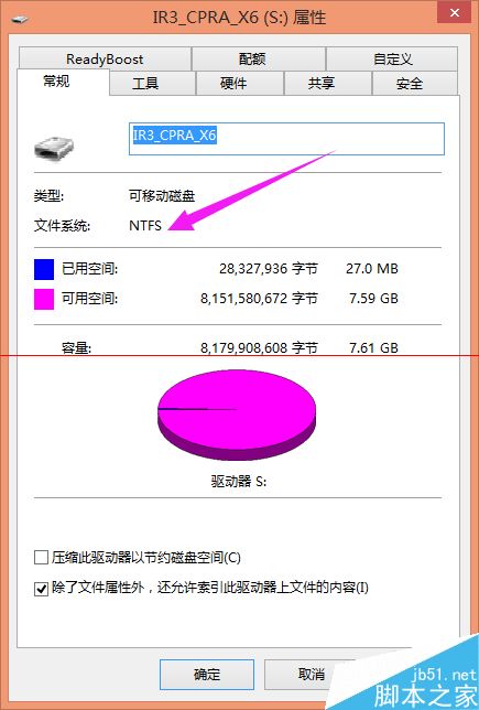 4、格式化完成后右鍵優盤--屬性,發現文件系統改為NTFS;然后在進行復制便可以了。