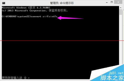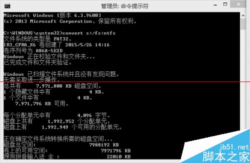 3、輸入 convert s:/fs:ntfs (可復制,但記得修改)按回車,等待轉換文件系統,(其中s:的s指的是第一步中的驅動號碼)。