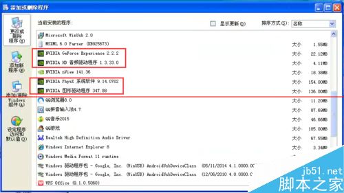 2、在“控制面板”中的“添加或刪除程序”里卸載掉NVIDIA顯卡驅動以及所有組件(如下圖),并根據提示重啟計算機。