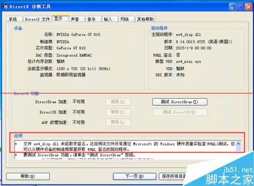 由于微軟已停止維護XP系統的緣故,NVIDIA官方也不再對XP系統下的顯卡驅動進行WHQL的簽名認證。因此,當XP系統安裝了太新的顯卡驅動后,會由于顯卡驅動中的文件沒有數字簽名從而導致DirectX功能無法正常使用。從DirectX診斷工具的“說明”中能夠看到具體原因(如下圖)。
