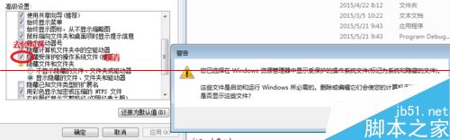 4、檢查發(fā)現(xiàn),沒有隱藏文件。第二個原因,查看隱藏受保護的操作系統(tǒng)文件(推薦)去掉選中的勾選。