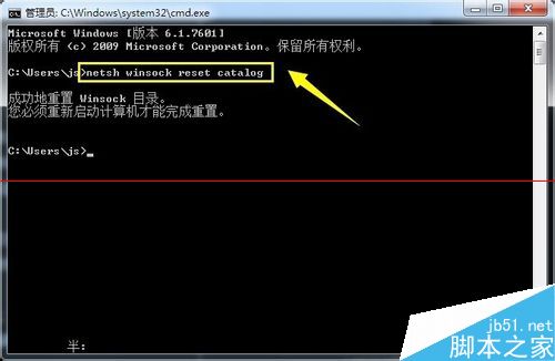 8、從打開的MSDOS界面中,輸入命令“netsh winsock reset catalog”并按回車鍵,以完成WinSock目錄的重置操作。