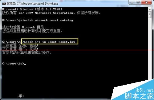 9、接著輸入“netsh int ip reset reset.log”并按回車鍵,以完成對合局網絡接口的重置操作。最后重啟一下計算機,即可實現禁用無線網絡操作。