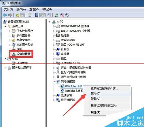 4、接著在打開的“計算機管理”界面中,展開“設備管理器”項,右擊無線網卡驅動,選擇”禁用“項來實現對無線網絡的禁用操作。