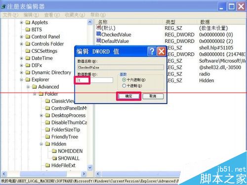7,在編輯DWORD值窗口,將“數值數據”下的0值改為1值,然后按“確定”。這一項就修改過來了,提示,1值為允許修改隱藏屬性,0值為不允許修改隱藏屬性。