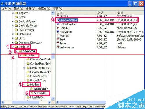 6,進入注冊表后,按【HKEY_LOCAL_MACHINE/SOFTWARE/Microsoft/Windows/CurrentVersion/Explorer/Advanced/Folder/Hidden/SHOWALL】此路徑找到右側的Checkedvalue項,雙擊這項。