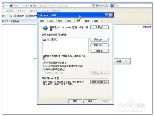 6、切換到”連接“選項卡下,如圖:我們可以看到和網絡屬性中一樣名稱的寬帶連接。