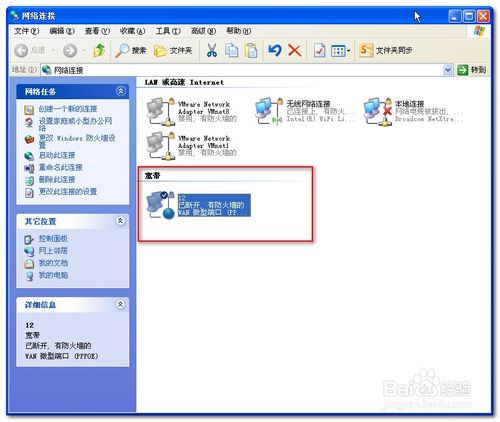 2、在彈出的“網絡連接”對話框中找到“寬帶”項目下的連接,如圖: