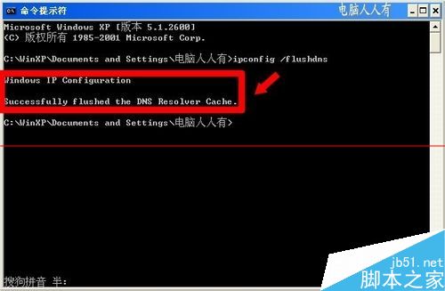 6、再在命令提示符窗口中輸入:ipconfig /flushdns 回車執行命令,重建本地DNS緩存(之后會有清理成功的提示)。