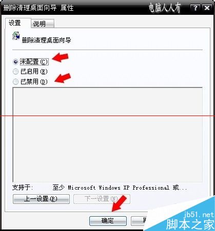 4、在打開的刪除清理桌面向導屬性選項卡中點選未配置或者已禁用→確定,再回到桌面右鍵菜單中就會有運行桌面清理向導菜單了。