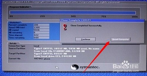 4、 還原文件完成后點擊“reset computer ”提示重啟你的電腦。以便進行下一步的安裝