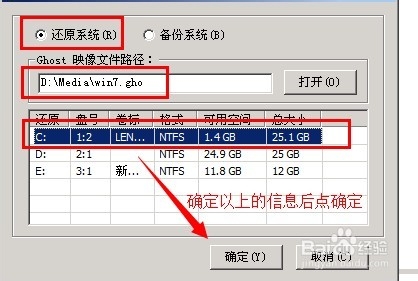 2、下載本文上面提供的最新版本的onekey,打開剛才你復制到最后一個分區的gho文件。我的gho文件是拷貝到的路徑是:D:/media/win7.gho,選擇的是藍色陰影的C盤。