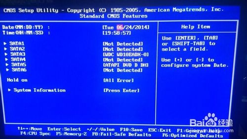 按F1就進入了BIOS頁面,查看是否開啟了軟驅。然后進入Standard CMOS Features,發現日期、時間正確,發現也沒有開啟軟驅,只有WDC WD10EADX-0(這個是硬盤),另一項含DVD的是DVD,如果開啟了軟驅,則改成 相應的Not Detected選項。