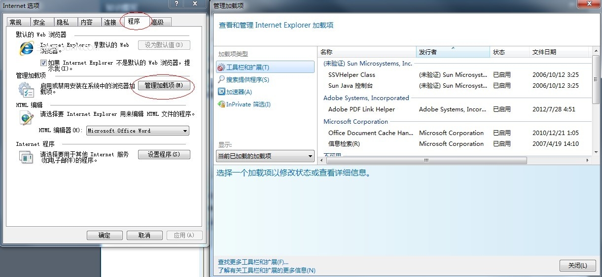 步驟一 Internet選項管理加載項中禁用有關加載項,也可以使用antoruns禁用IE加載項。