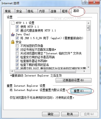 Internet選項-高級-重置/還原高級設置,刪除歷史記錄、cookies等,安全-默認值。