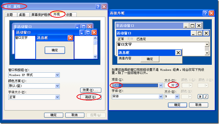 1. 如果是Windows XP系統,就在桌面空白處右擊選擇“屬性”,切換到“外觀”選項卡,點擊“高級”按鈕,在“高級外觀”中選擇將圖標的大小任意增大或減小,點擊“確定”。如圖3。這樣系統就會自動重建圖標緩存文件了。