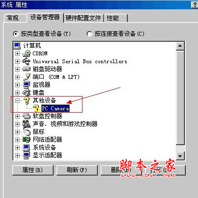 步驟二、完成上面的步驟后,插入USB攝像頭,這時電腦會發現新硬件并彈出安裝驅動的信息,選擇取消,然后用鼠標右鍵點擊我的電腦,選擇屬性,在彈出系統屬性界面中,進入系統屬性-硬件-設備管理器將帶有感嘆號的PC CAMERA按鼠標右鍵卸載。