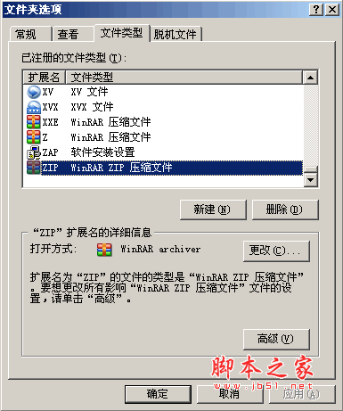 (2)在隨后出現窗口中的“已注冊的文件類型”列表中找到ZIP(EXE、RAR文件也可以采用這樣的操作步驟)文件的項目,用鼠標選中該項目。