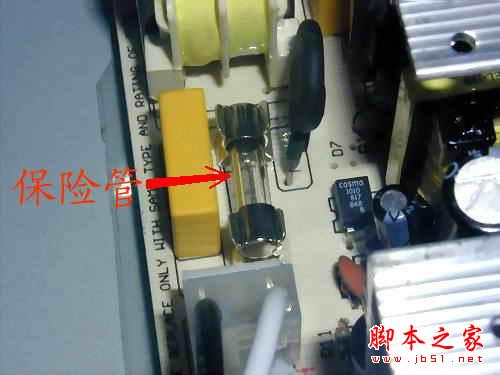 由于檢修電源要接觸到220V高壓電,人體一旦接觸36V以上的電壓就有生命危險。因此,在有可能的條件下,盡量先檢查一下在斷電狀態下有無明顯的短路、元器件損壞故障。首先,打開電源的外殼,檢查保險絲(圖5)是否熔斷,再觀察電源的內部情況,如果發現電源的PCB板上元件破裂,則應重點檢查此元件,一般來講這是出現故障的主要原因;聞一下電源內部是否有糊味,檢查是否有燒焦的元器件;問一下電源損壞的經過,是否對電源進行違規的操作,這一點對于維修任何設備都是必須的。在初步檢查以后,還要對電源進行更深入地檢測。