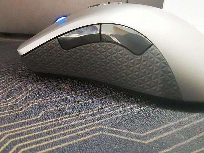 外殼表面采用槍灰色噴砂。防指紋、防打滑、抗油污能力一流。并且槍灰色給M600帶來了一些外觀上的高級感。整體質感可以參考ROG家的槍灰色鼠標外殼。