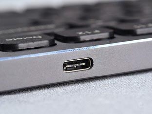 鍵盤上方分布了電源開關、Type-C充電口以及一片跑道形的黑色光滑的平面,這個位置是鍵盤的天線開槽。畢竟,鋁合金外殼會產生很好的屏蔽效果,而鍵盤的連接則依靠藍牙以及2.4GHz接收器兩種方式完成。接收器被磁吸放置在鍵盤背面,牢固易取。