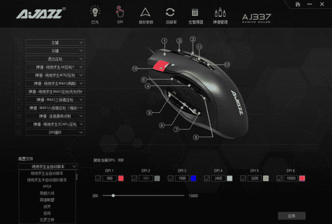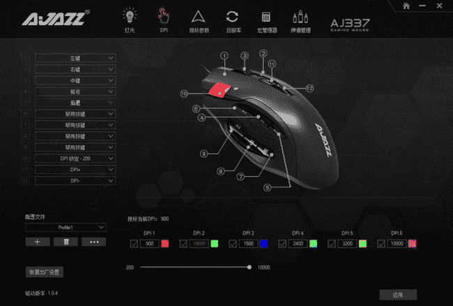鼠標必須配合驅動使用才能解鎖強大的宏輔助功能,可以看到驅動的管理界面雖然看起來感覺可自定義的項目很多,但是功能基本一目了然。采用RGB燈效顯示DPI檔位,而且每個DPI檔位都可以設置對應的燈光顏色,便于專業玩家通過燈光辨識自己想要的DPI調整需求。
